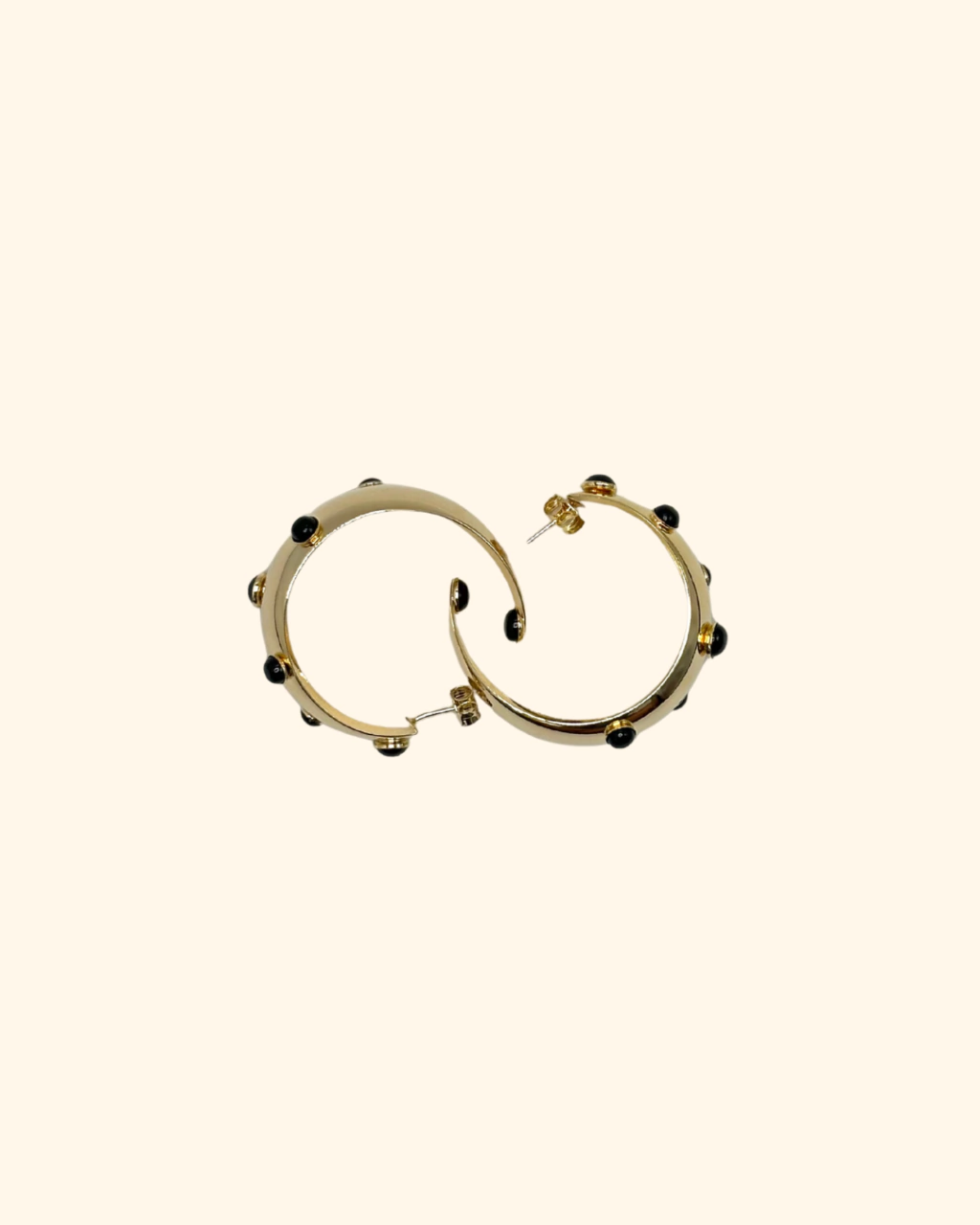 Argola banhada a ouro com bolinhas em resina preta, tamanho G. Peças hipoalergencias, sem níquel na composição.